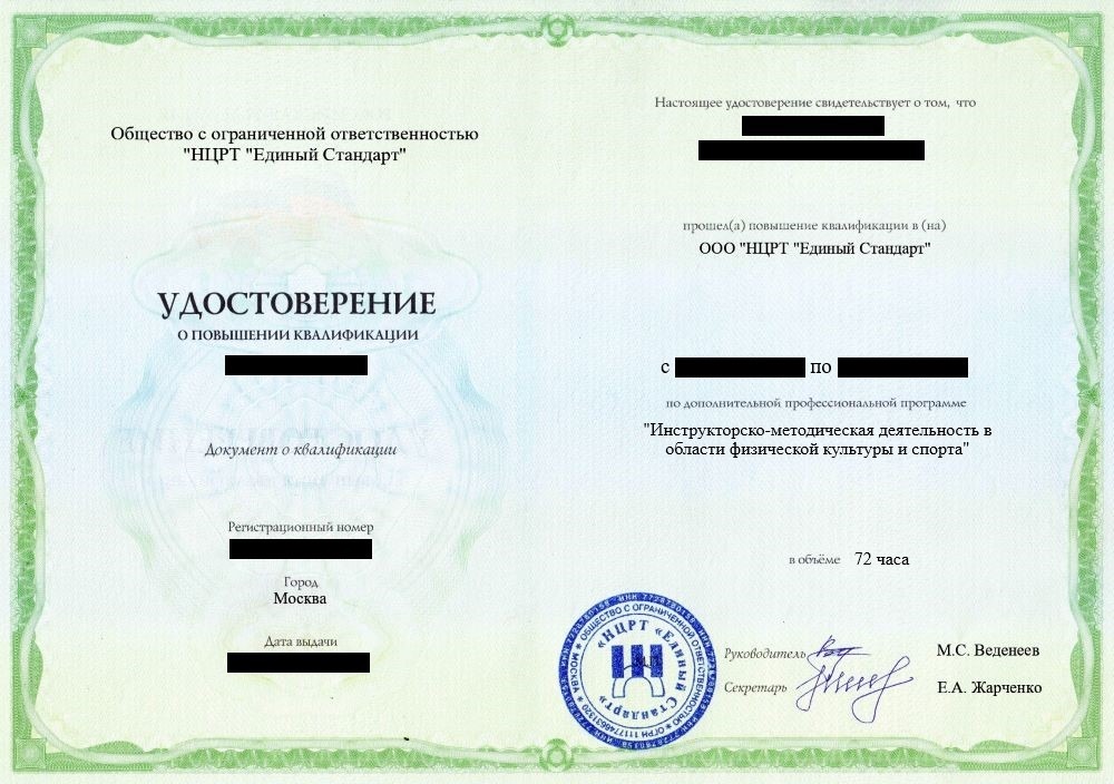 • Удостоверение о повышении квалификации установленного образца. Срок действия: 3 года